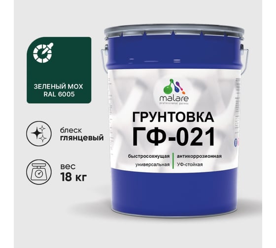 Грунтовка MALARE ГФ-021 для металла, по дереву, для минеральных поверхностей, RAL 6005, зелёный мох, глянцевая, 18 кг 2038119869261