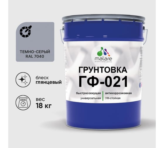 Грунтовка MALARE ГФ-021 для металла, по дереву, для минеральных поверхностей, RAL 7040, темно-серый, глянцевая, 18 кг 2038119892658
