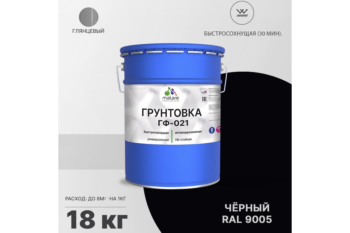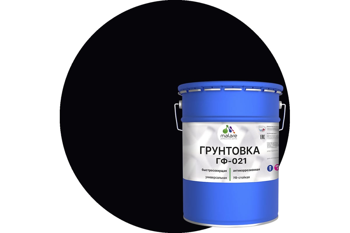 Грунтовка MALARE ГФ-021 для металла, по дереву, для минеральных поверхностей, RAL 9005, черный, глянцевая, 18 кг 2038119892979