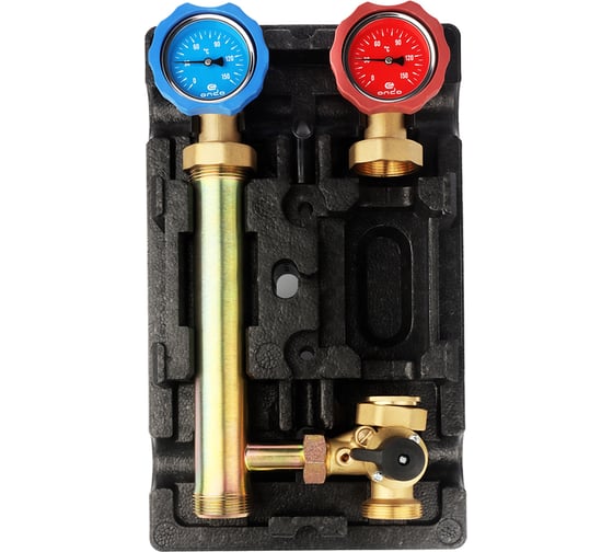 - запорный узел на обратной линии с обратным клапаном (термометр с синим кольцом)