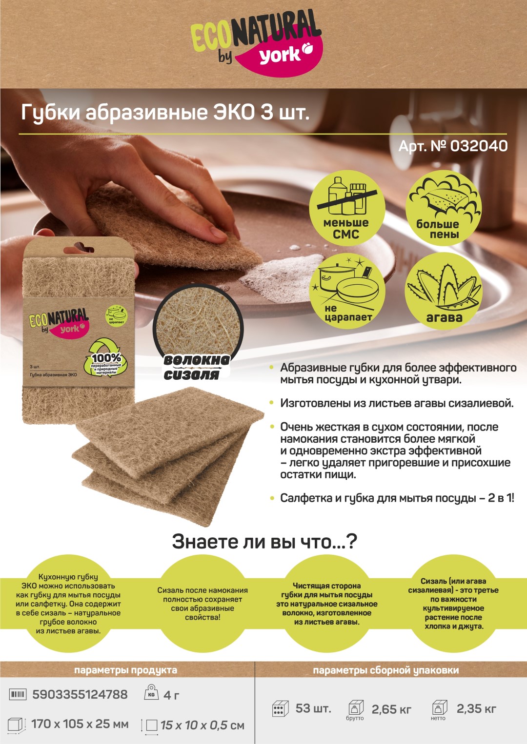 Губки абразивные YORK ЭКО Натурал 3 шт. 032040