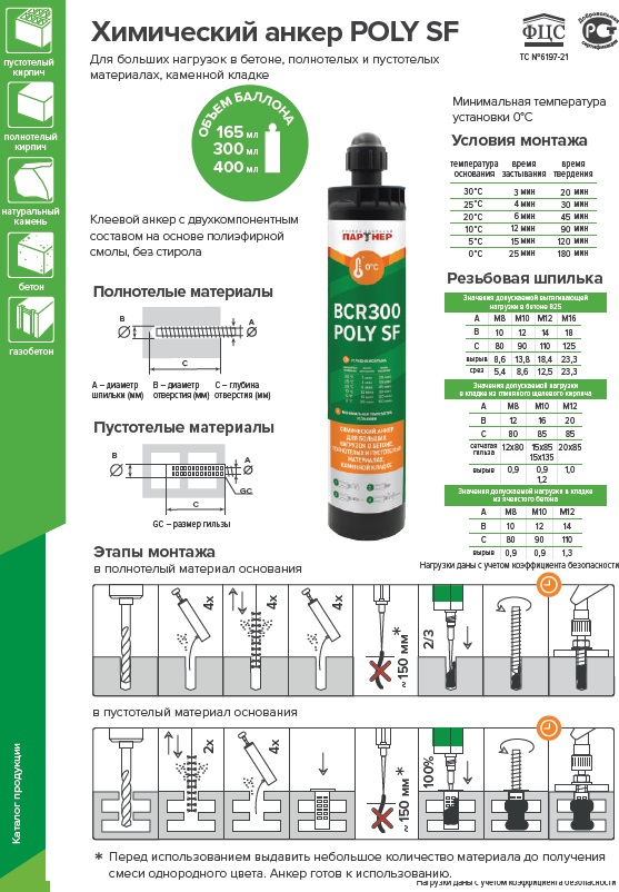 Химический анкер Партнер BCR 300 POLY SF 827264 - клеевой анкер с двухкомпонентным составом на основе полиэфирной смолы, без стирола.