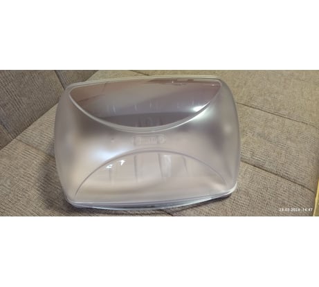 Достаточно компактная, по исполнению вполне хорошая без всяких заусенцев и так далее на пластмассе, ровная и не перекошенная, литьё достойное. Основание приятного розового цвета, крышка чуть туманная прозрачная. Батон белого и половина черного влезает (живу один), чтобы крышка закрывалась и хлеб не сох, для семьи и большой семьи, боюсь, что не подойдёт по вместимости.