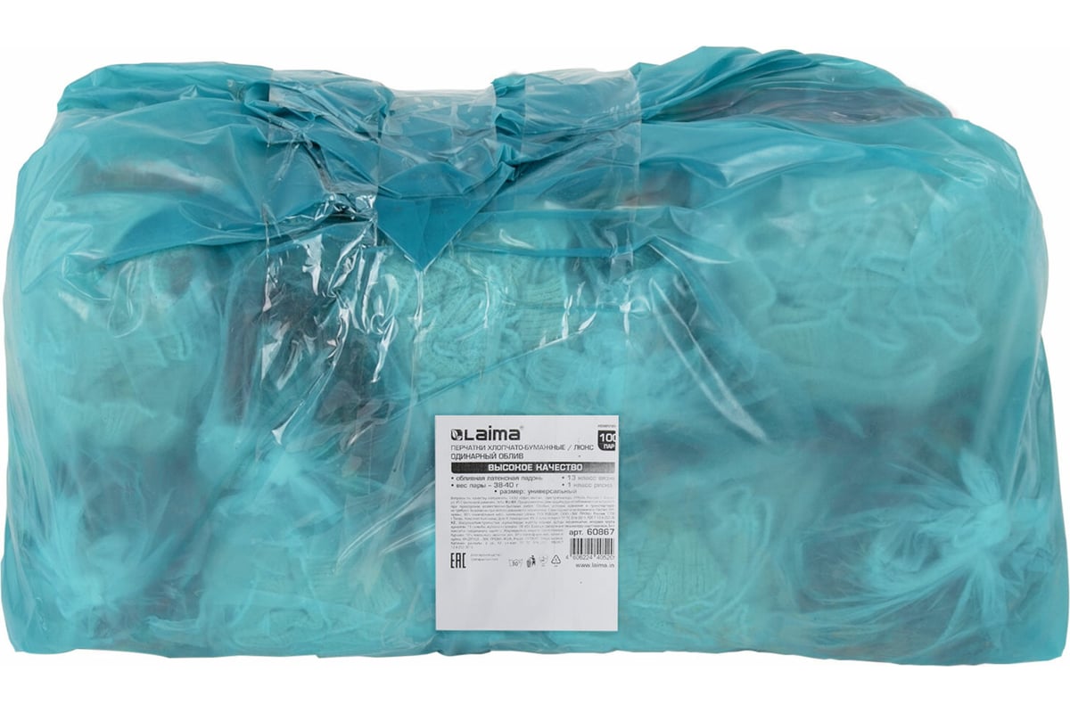 Технические характеристики хлопчатобумажных износостойких перчаток LAIMA Люкс 13 класс, одинарный облив, 38-40 г 100 пар 608672