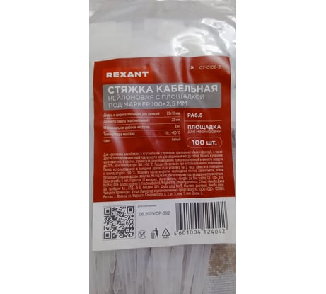 Хомут с площадкой под маркер REXANT 100x2,5 мм, белый, 100 шт. 07-0106-2 На страницу товара104 ₽