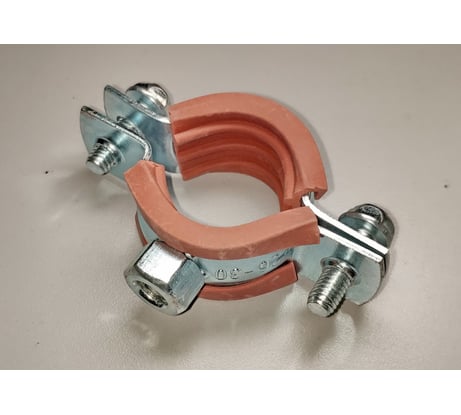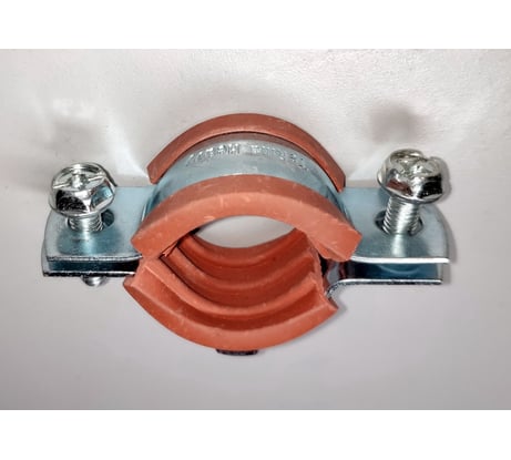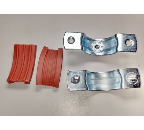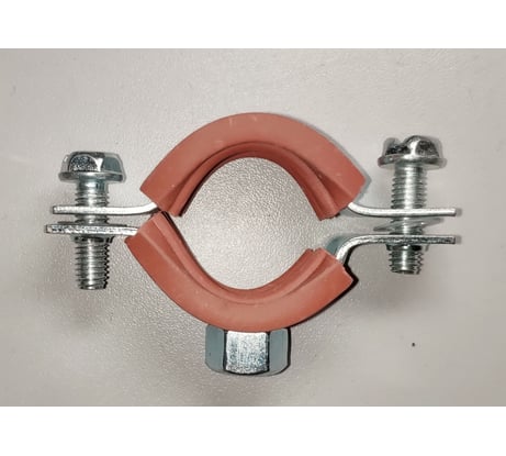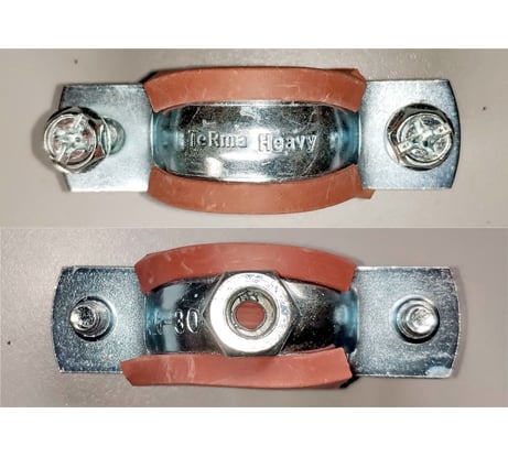 Выполнен из полосы 20х1,4 (мм), гайка подвеса М8х6, стяжные винты М6х20 (резьбы, как на винтах, так и на скобах грязные криво-косо резанные, ~15% сорваны) между винтами 46 мм, D обхвата 22-36, Уплотнитель: внутренний размер 19х3 (мм), толщина в рабочей зоне 1,5 мм + 3,5 мм рёбра, в удерживающей 1 мм (сползает сам по себе, при затяжке ползёт во все стороны).