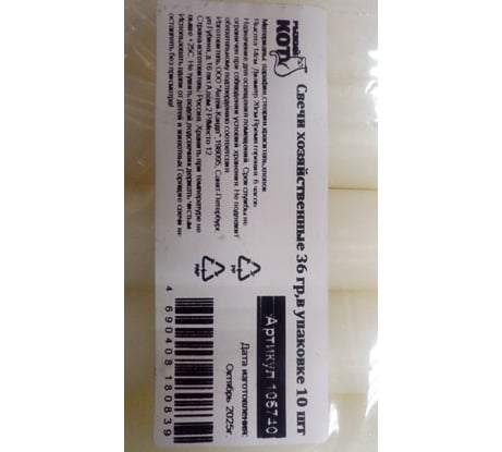 Хозяйственные свечи Рыжий кот 36 г, в упаковке 10 шт 105740 используются в случае аварийного отключения электричества или в помещении, где электроснабжение отсутствует.