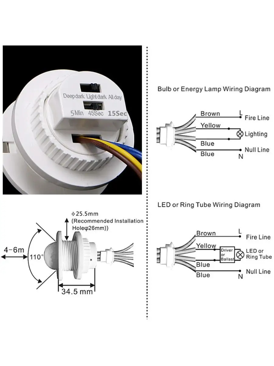 - Встроенный датчик освещенности: Да (датчик не включает освещение, если вокруг светло).