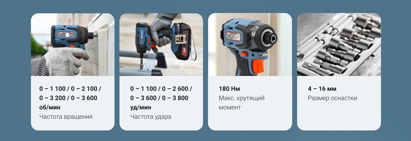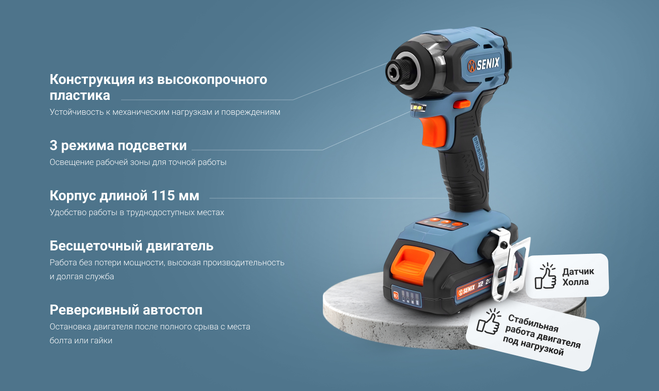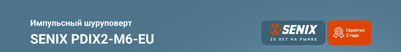 Импульсный шуруповёрт SENIX PDIX2-M6-EU - это суперсила в компактном корпусе. С 180 Нм момента и импульсным режимом он закрутит 16-миллиметровый болт в бетон, как в масло, а его вес меньше килограмма (без АКБ) позволит работать хоть на лестнице, хоть под потолком, не чувствуя усталости.
