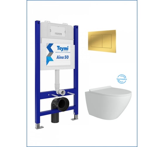 Инсталляция комплект 5 в 1 Teymi унитаз подвесной безободковый торнадо Lina Pro Vortex кнопка золото F16091 ЦБ-00302403
