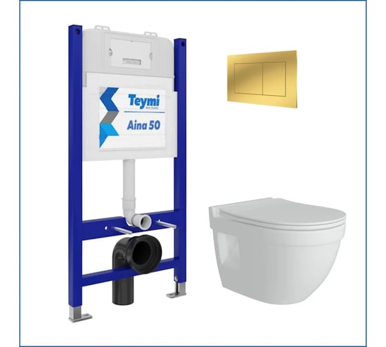 Инсталляция комплект 5 в 1 Teymi унитаз подвесной безободковый Vitra Pro кнопка золото F1 F16076 ЦБ-00299358