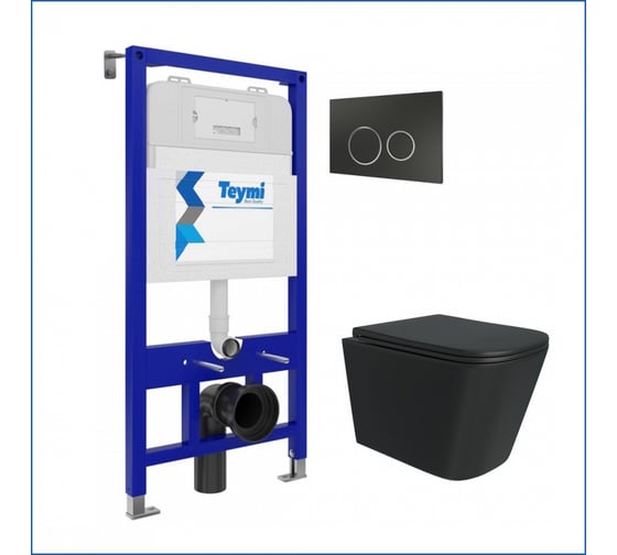 Инсталляция с унитазом комплект 5 в 1 Teymi унитаз подвесной безободковый черный Helmi Black кнопка черная/хром F13347 ЦБ-00302388