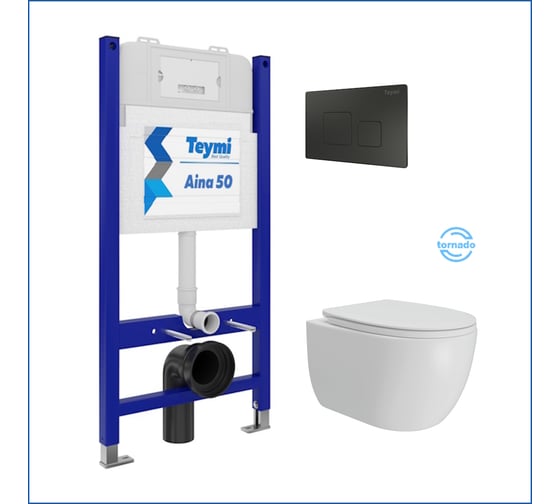 Инсталляция с унитазом Teymi комплект 5 в 1 унитаз подвесной безободковый Lori Vortex кнопка черная F15826 F15826 ЦБ-00304338