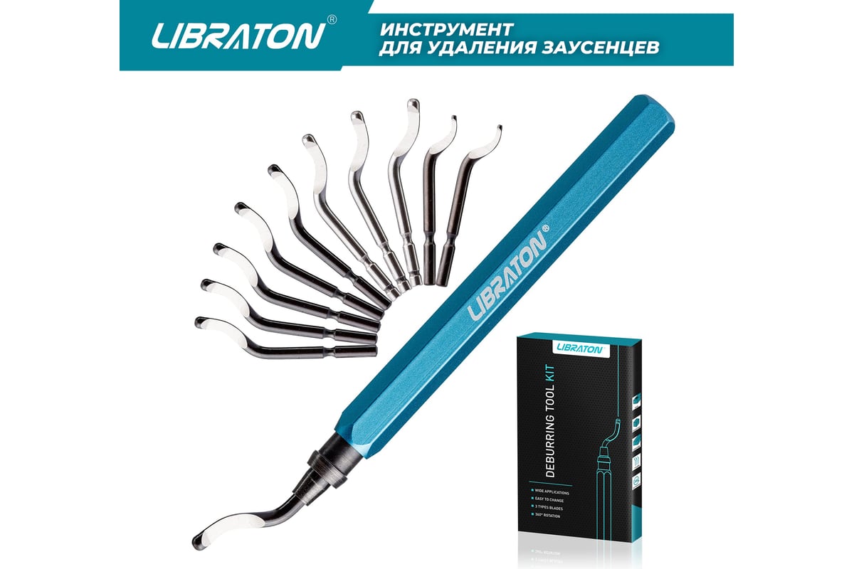 Набор инструментов для снятия заусенцев Libraton включает алюминиевую ручку и 11 лезвий из быстрорежущей стали.