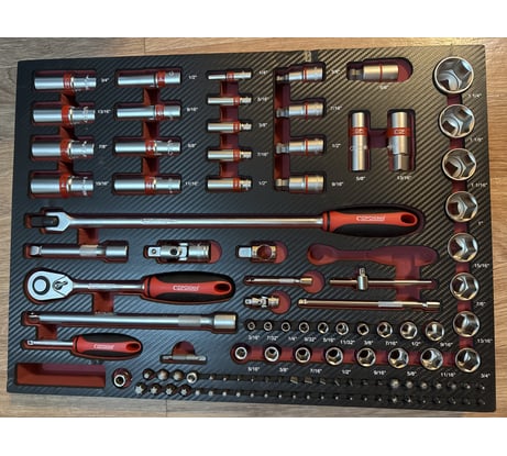 В связи с покупкой американского мотоцикла потребовался соответствующий набор инструментов. Поиск на разных площадках привел к выводу, что ценник на этот набор не так высок, как кажется на первый взгляд. Ну и захотелось, наконец, соорудить тележку с инструментом для гаража. Разочаровал не полный размерный ряд шестигранников. При этом многие шестигранники и торксы дублированы. Почему и зачем - загадка. В остальном ключи крепкие, трещотки приятные, вроде бы надежные. Удлинителей достаточно. В целом набор практически самодостаточный, докупать нужно не так много. Быстро сломалась пружинка-фиксатор в держателе шестигранников и торксов. Без пружинки они легко выпадают, что неудобно. Ну и совсем как придирка: ложемент слегка шире полки в трехэтажной сорокинской тележке, складочка образуется )
