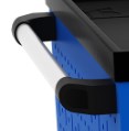 В тележку помещается почти весь гаражный инструмент. Колеса прорезиненные, по неровностям инструмент внутри не прыгает если постелить поролон. На самой тележке пластиковый поддон с небольшими открытыми коробочками, в которую помещаются мелочи в виде болтов, гаек и шайб. Так же у ящика есть большая ручка, чтобы передвигать тележку по помещению. Ручка хорошо крепится к корпусу тележки, что позволяет край приподнимать.
