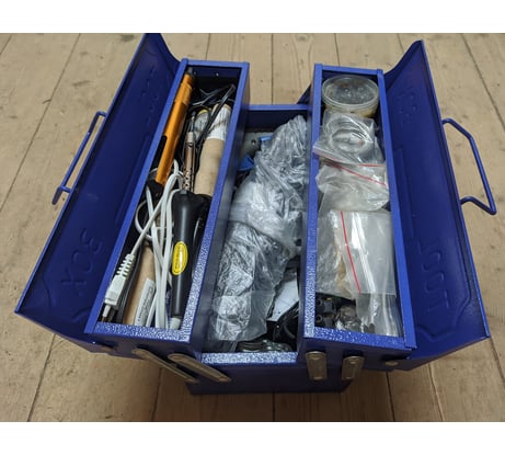 Если вы думаете что за восемь сотен можно получить мегаящик, ну... неможно. Этот ящик успешно может участвовать в оффроуде за счёт длинных ходов углов на диагональном вывешивании, или служить кузовом пикапа, который должен уметь сворачиваться винтом чтобы не лопаться по швам. Для ящика это непозволительно, сия смесь желе с шоколадной пастой мне лично пригодилась только под относительно лёгкие паяльные принадлежности, термоусадку, релюшки/наконечники. На фото это его нормальное состояние, он разумеется раскладывается, держит условно прямоугольную форму, даже покрашен нормально, краска не отшелушивается. Но что-то тяжелое в него я не положу, потому что в принципе-то объём позволяет плотненько его набить металлом, но тогда он перейдёт в разряд стационарного ящика, переносить будет неудобно.
