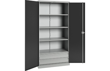 Как владелец сервиса - не стал бы брать для профессиональной деятельности - слишком тонкий металл, стенки гнутся и деформируются от несильного нажатия, ограничение доступа - символическое. Нет ножек, не регулируется, перекос влево - левая дверь все время открывается, а правая закрывается :))