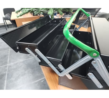 Отличный инструментальный ящик. Сложил весь инструмент по электрике. В отличие от обычного ящика доступ ко всему сразу, не надо копаться и все вынимать, чтобы добраться до инструмента на дне ящика. Окраска ящика идеальная, сам ящик пришел упакованный в пакет и картонную коробку. Если ручка ящика мешает, ее можно сложить на бок. Внутри оклеил ящик карпетом. Теперь ничего не брякает, инструмент не бьётся с грохотом об стальные стенки. Сверху на крышке ящика есть отверстие для навесного замка. Размеры большого отсека ДхШхВ 45х20х10см, маленькие отсеки 45х10х5см. За акционную цену в 2778₽ идеальный вариант!