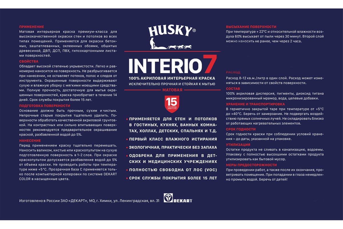 Краска для стен HUSKY INTERIO 7 Жёлтое лимонное мороженое, 9 л 32551 - матовая исключительно прочная и стойкая к мытью акриловая краска премиум-класса для стен и потолков во всех типах сухих и влажных помещений: гостиные, кухни, ванные комнаты, холлы, детские комнаты, спальни, офисные помещения и т. д.