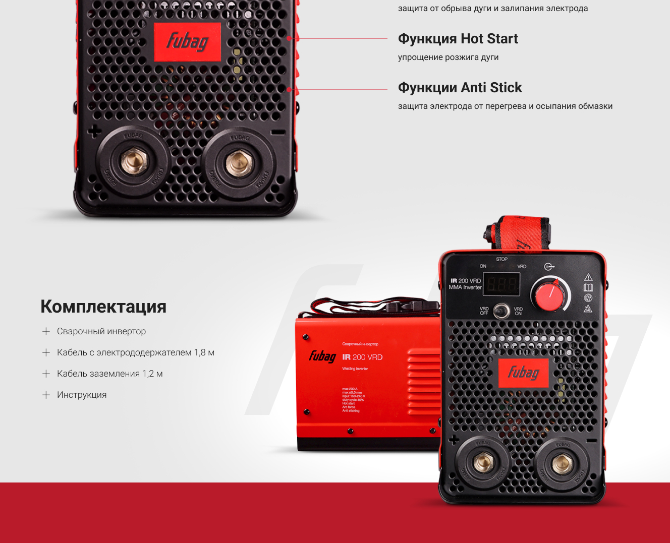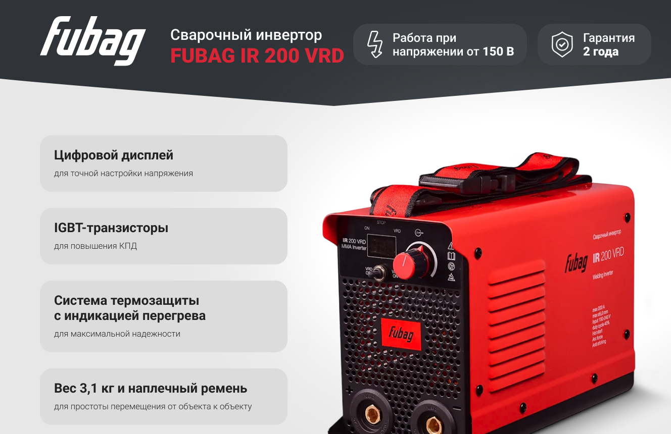 Инвертор MMA сварки FUBAG IR 200 VRD сварочный ток 200 А, рабочее напряжение 150-240 В 41328