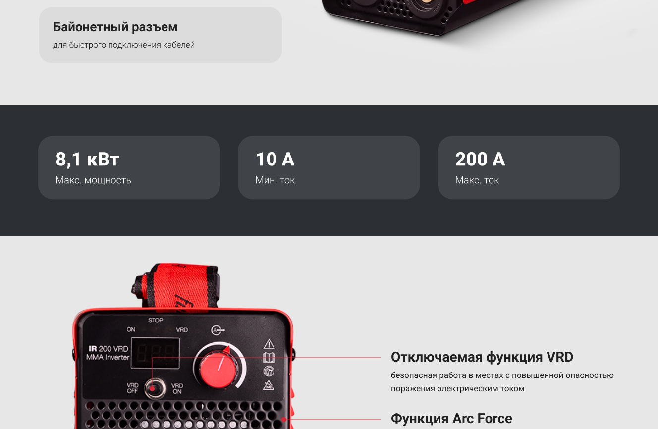 - Отключаемая функция VRD (понижение напряжения холостого хода до безопасного уровня)