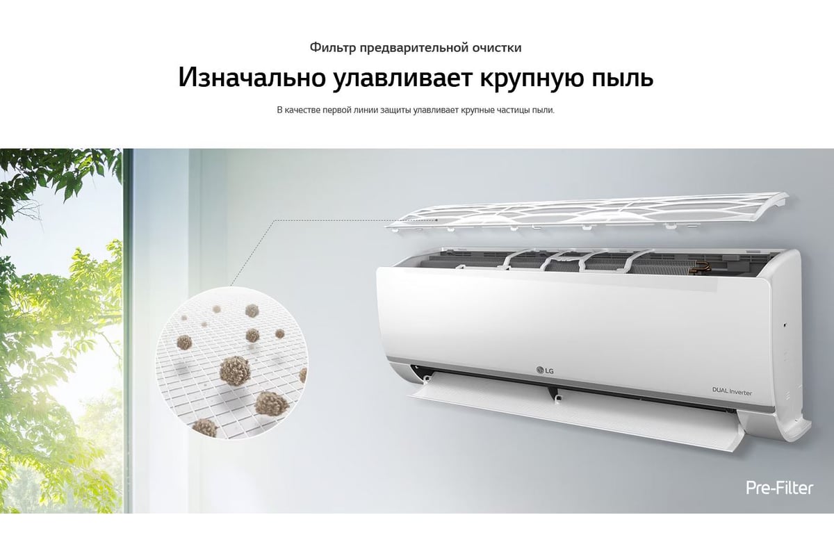 - Низкий уровень шума. Кондиционеры LG работают с низким уровнем шума благодаря уникальному наклонному вентилятору и технологии DUAL Inverter Compressor от LG, которые позволяют устранить лишний шум и делают работу более плавной