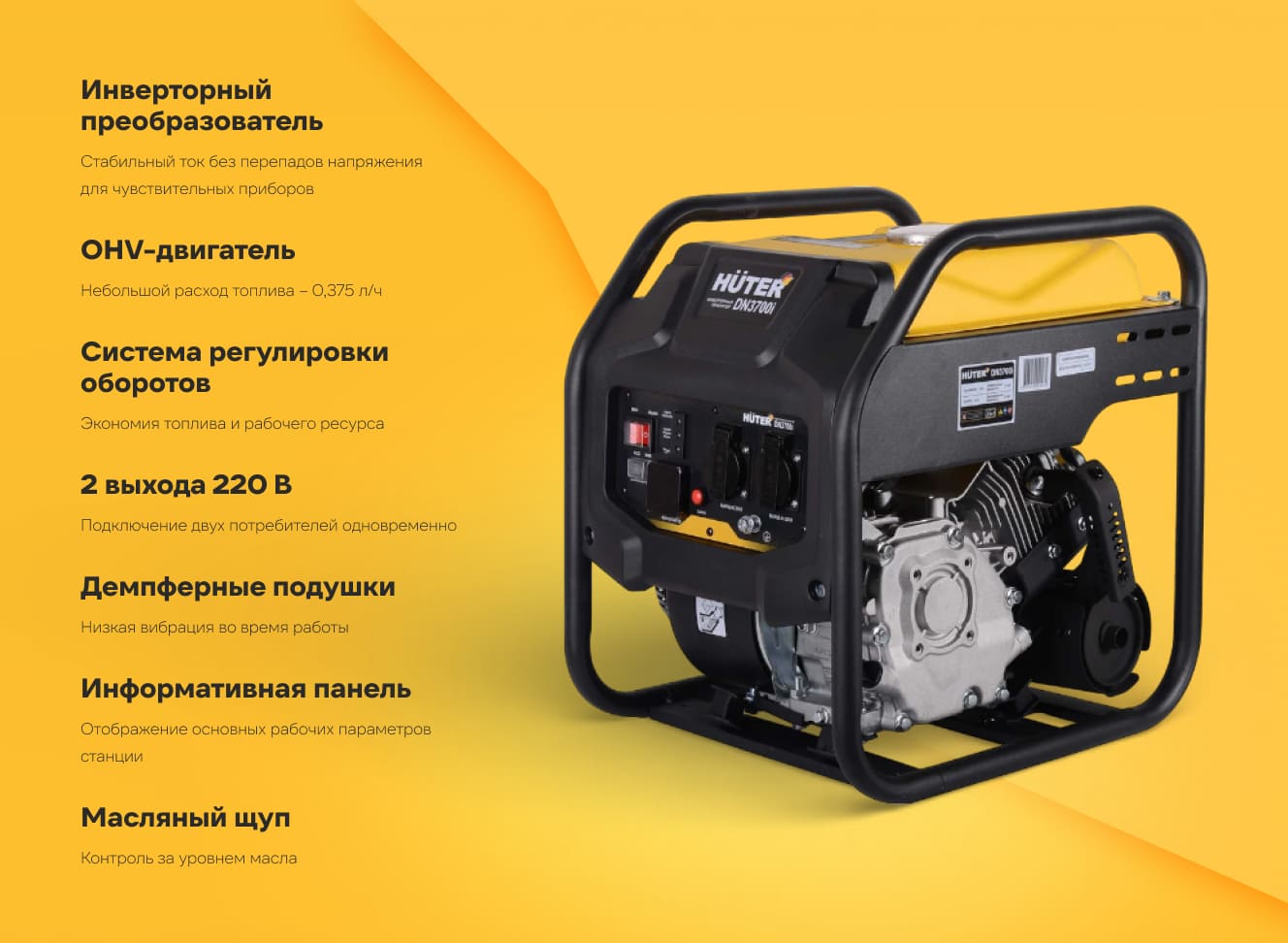 Инверторный генератор DN3700i Huter — компактный и надежный источник автономного питания, разработанный специально для снабжения электричеством приборов бытового назначения. Прекрасно подойдет как резервный источник питания в домах, на даче, строительстве или отдыхе на природе.