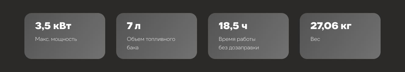 Работа генератора основана на бензиновом двигателе, который использует в качестве топлива стандартный бензин марки АИ-92. Объём бака составляет 7 л, что обеспечивает значительную продолжительность автономной работы. Система смазки вмещает 600 мл масла, обеспечивая долговременную службу механизмов.