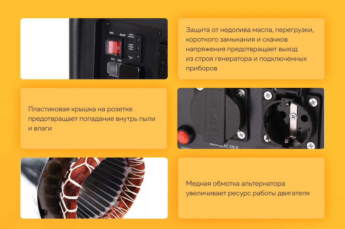 - Защита от короткого замыкания, перегрузки и низкого уровня масла