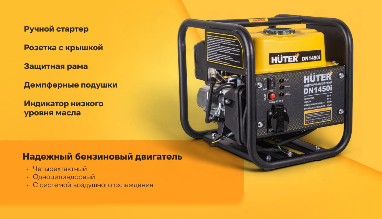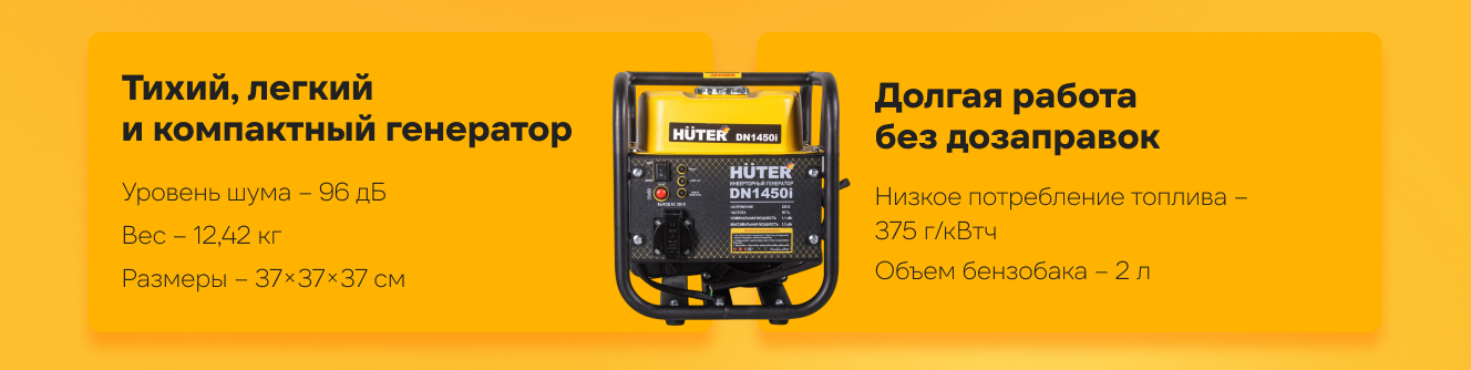 Инверторный генератор DN1450i от Huter станет надежным помощником в любых ситуациях, требующих автономной подачи электроэнергии.