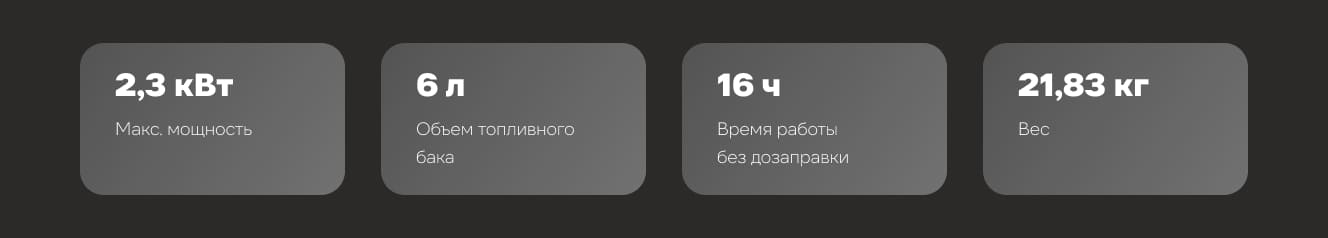 Аппарат оснащен карбюраторным двигателем, использующим обычный бензин марок от АИ-92. Его пиковая мощность достигает 2300 Вт, а рабочая нагрузка поддерживается на уровне 2000 Вт. Низкий расход бензина (375 г/кВтч) обеспечивает долгую работу на одном баке объемом 6 л.