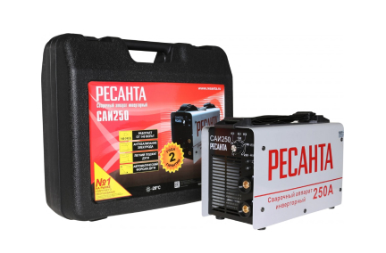 За продолжительную и длительную работу отвечает защита от перегрева, которая автоматически срабатывает. Большие вентиляционные отверстия и принудительное охлаждение сварочного инверторного аппарата уменьшают шансы перегрева. Предусмотрена функция «анти-залипание». Важное преимущество этой опции в том, что она упрощает процесс сварки. Удобство эксплуатации сварочного аппарата модели Ресанта САИ 250 в кейсе также обеспечивает «Горячий старт», который самостоятельно повышает ток в начале работ, и «Форсаж дуги» (гарантирует устойчивость сварочной дуги и улучшает текучесть металла). Для простоты хранения и перевозки предусмотрен кейс.