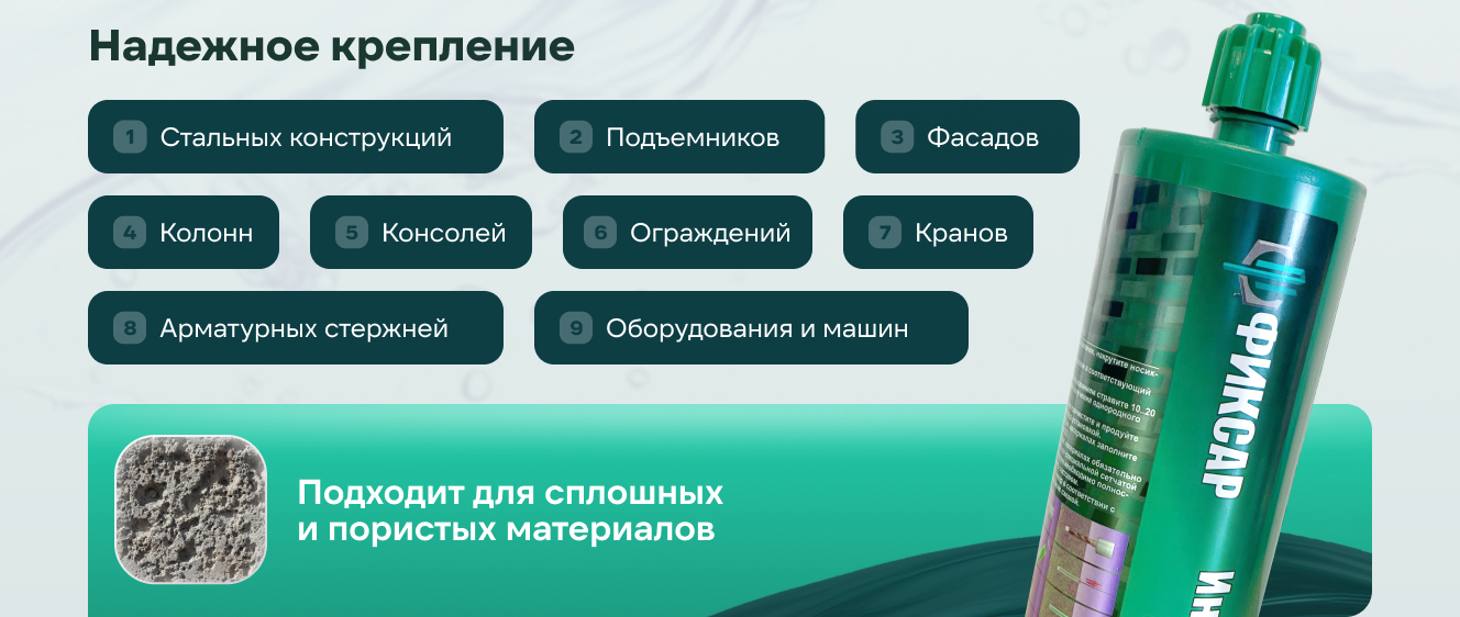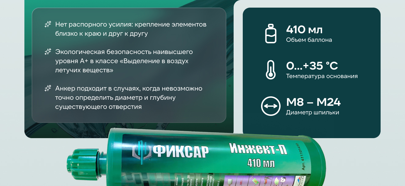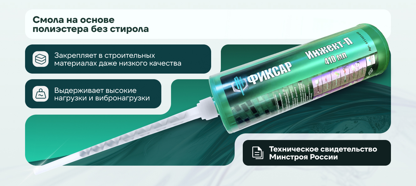 Инжекционная масса Фиксар Инжект П 410 410 мл 611101410 - это смола на основе полиэстера без стирола. Комплект для инжекции предоставляет простой способ крепления в сплошные и пористые материалы. Анкер имеет ряд уникальных особенностей: стоек к вибронагрузкам, выдерживает высокие нагрузки.