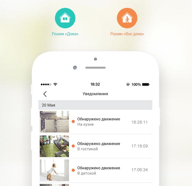 Два режима: "дома" и "вне дома" При обнаружении движения в кадре устройство моментально отправляет уведомление на телефон. |