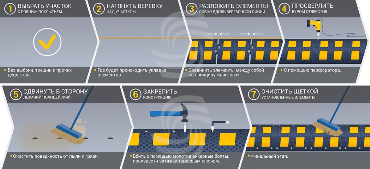 Все отверстия для крепежа армированы специальными металлическими шайбами, что предотвращает разрывы и трещины в местах установки. Наличие дренажной системы в искусственной неровности позволяет воде свободно стекать, предотвращая образование луж. Водоотвод является важным фактором для безопасности дорожного движения, особенно в условиях плохой видимости и гололёда.