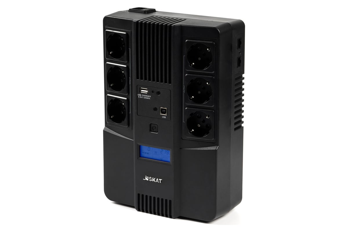 SKAT-UPS 800-AID-IN-1x9 - предназначен как для профессионального, так и для бытового назначения. Источник оснащен 6 розетками (с поддержкой и без поддержки резервной работы), LCD дисплеем, выходом USB для зарядки мобильных устройств и портами RJ-45 для защиты локальной сети - все что нужно для безопасной работы компьютерной техники.