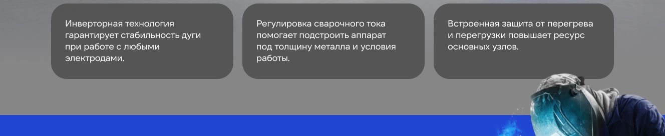 - Быстрая регулировка, адаптирующаяся к изменениям нагрузки, стабильная длина дуги, отличные характеристики постоянного тока