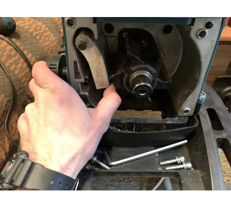 Фреза работает тихо, вежливо - не визжит, не чавкает. На сухих ветках аппетитно хрумкает. Если не может что-то прожевать, сама даёт стоп, потом реверс, потом хрумкает дальше. Подстстройку зазора сначала приходится делать каждые 10-15 минут, потом всё реже и реже. Процедура несложная, выполняется на ходу, одной рукой.