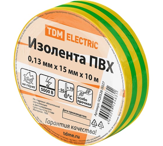 Отзывы об изоленте пвх TDM ELECTRIC 0,13x15 мм желто-зеленая 10 м SQ0526-0027
