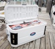 Изотермический контейнер COLEMAN 200qt Sport Ox Marine Cooler W 6499-799 - морской универсальный контейнер, используемый для хранения и транспортировки рыбы, мяса, фруктов или охлажденных напитков. Корпус изготовлен из ударопрочного пластика и имеет светоотражающее покрытие. Термоизоляция 7 см позволяет сохранять лед до 6 суток. Большая вместительность - 195 л. Обрезиненные ручки служат для удобства переноски контейнера.