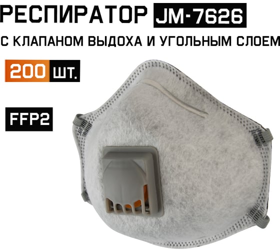 Полумаска (респиратор) JM-7626 (противопылевая, противоаэрозольная) с защитой от ЗАПАХОВ с клапаном FFP2, с угольным слоем, чашеобразная, с регулировкой резинок, коробка 200 шт.