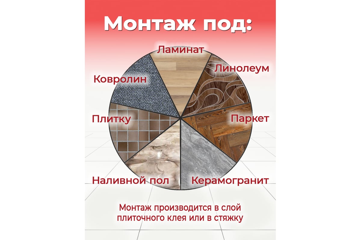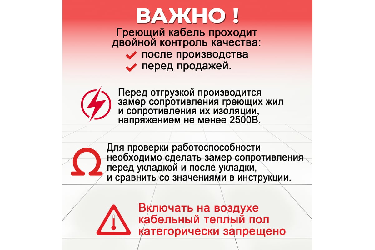 Warmcoin ECO проходит двойной контроль качества, проверяется напряжением 2500 В, а сопротивление изоляции не менее 1000 мОм значительно превышает требования ГОСТ (40 мОм), что гарантирует безопасность и надежность работы. Возможен универсальный монтаж – кабель можно укладывать как в плиточный клей, так и в стяжку. значительного подъема уровня пола.