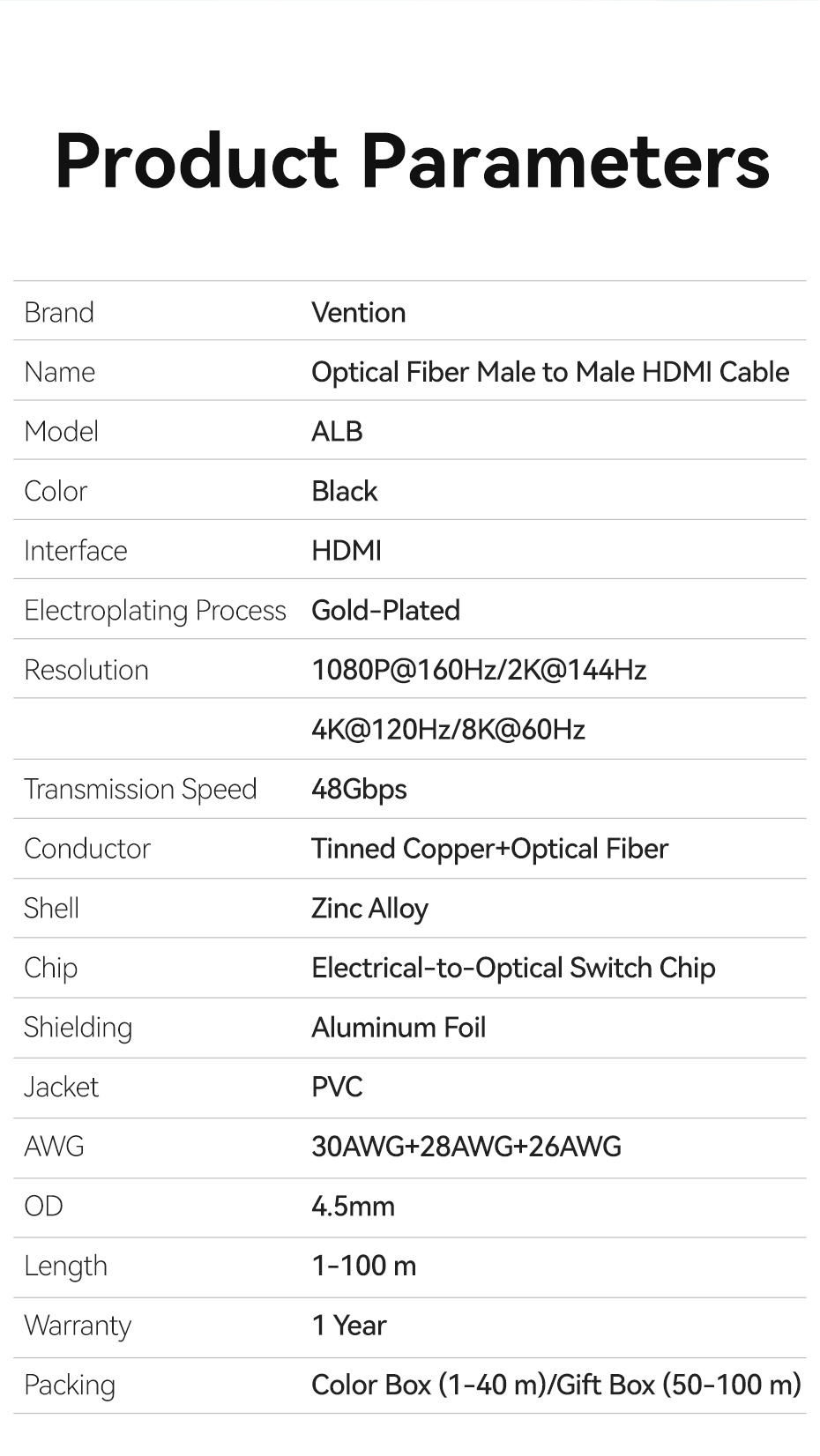 Цифровой кабель новейшего поколения для подключения источника видеосигнала и устройства отображения. Благодаря оптоволокну, передавать сигнал можно на большое расстояние вплоть до 100 метров. Канал Ethernet позволяет нескольким устройствам работать в сети Ethernet без необходимости подключения дополнительных проводов, а также напрямую обмениваться контентом, на скорости до 100 Мбит/сек.. Кабель имеет пропускную способность до 48 Гб/сек, поддерживает разрешение 8K (4320p) Ultra HD, 3D-возможности, Blu-ray, а также поддержку более чем 8 каналов аудио. Наличие обратного канала аудио устраняет необходимость в отдельном проводе для передачи звука в ресивер с телевизора или другого устройства, которое является одновременно источником аудио и видео.