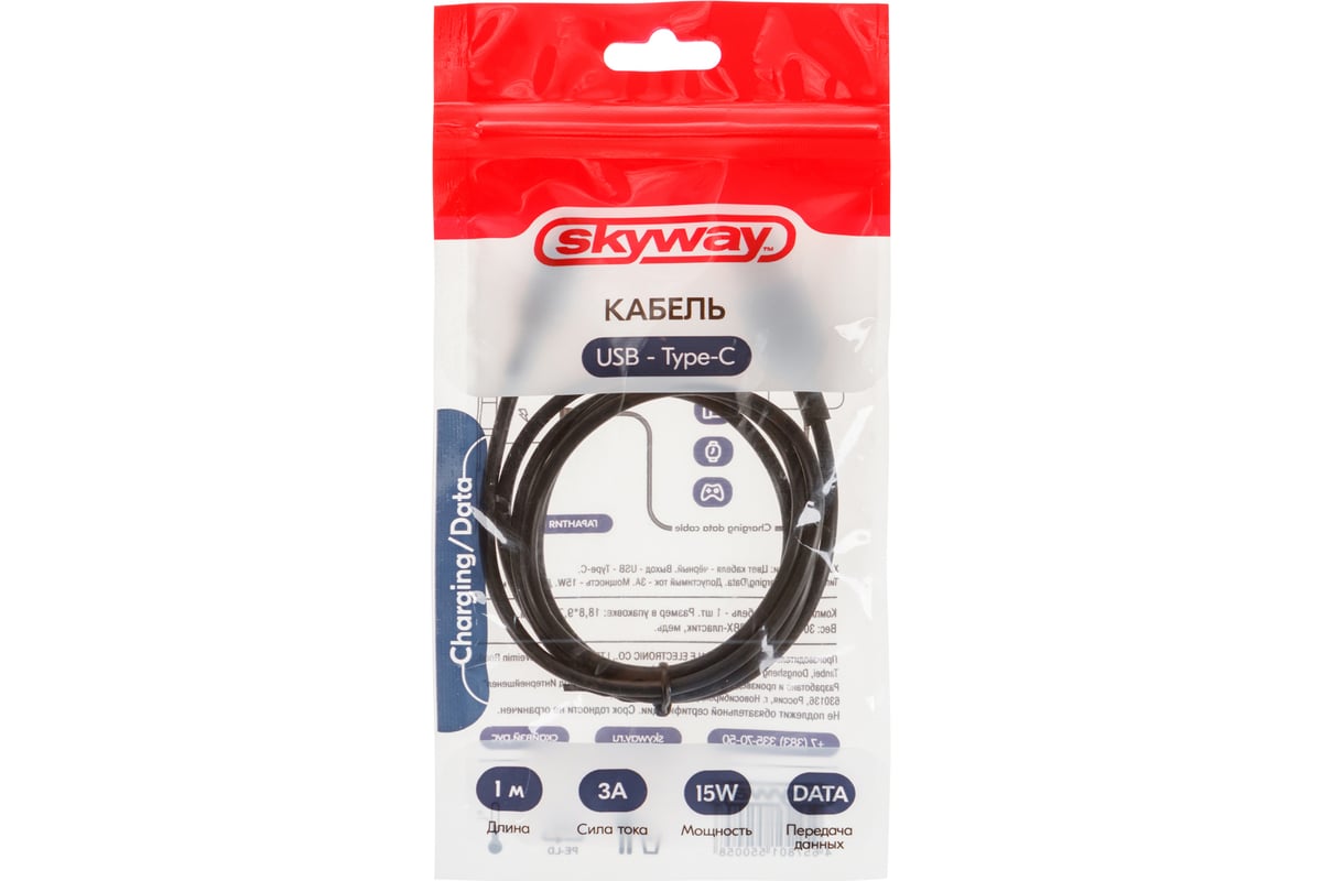 Технические характеристики SKYWAY usb - type-c, 15w, черный, в пакете, 1м S09603007