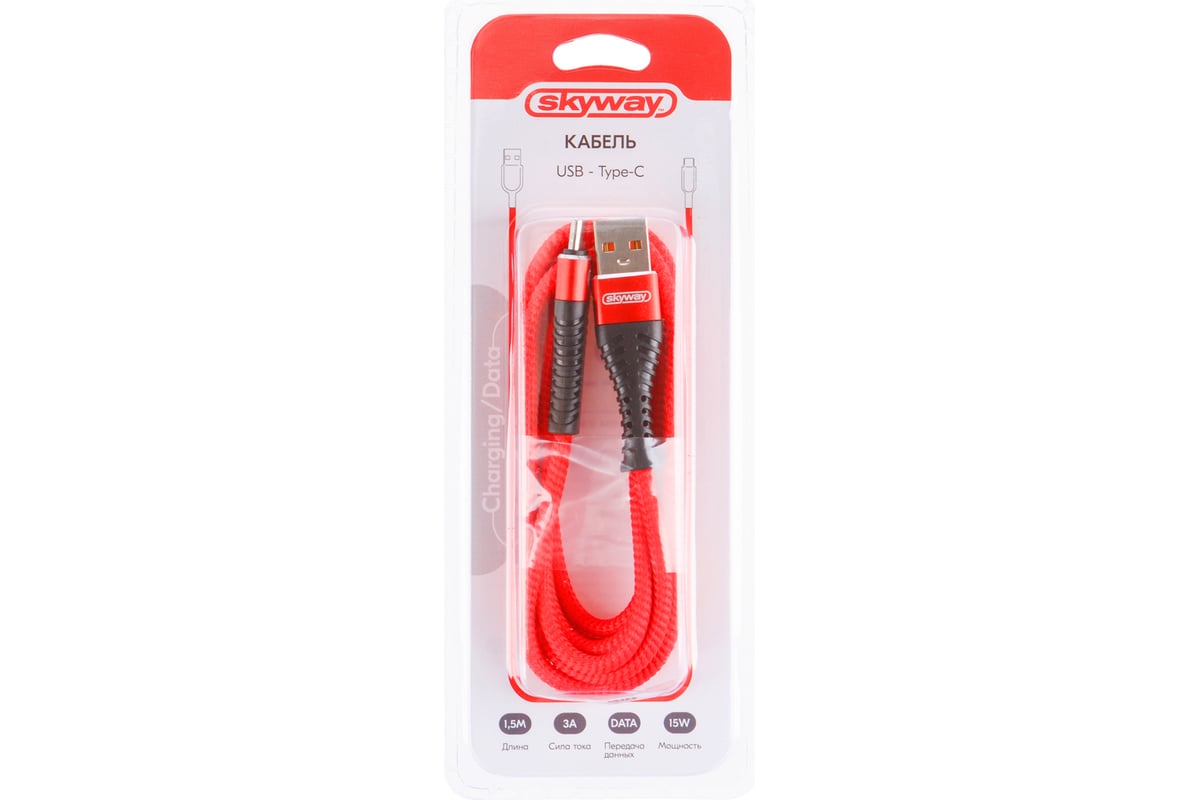 Кабель SKYWAY usb - type-c, 15w, в мягкой оплетке, красный, 1,5м S09603011