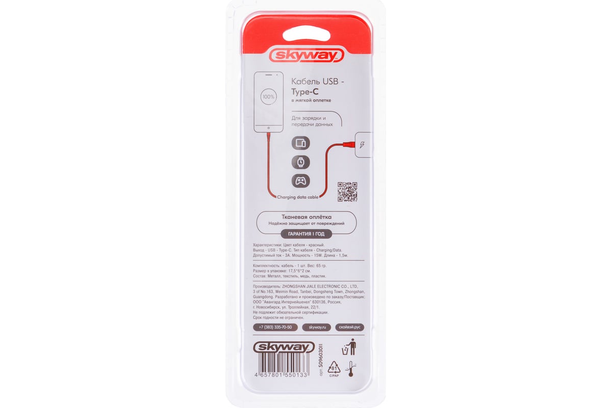 Технические характеристики SKYWAY usb - type-c, 15w, в мягкой оплетке, красный, 1,5м S09603011