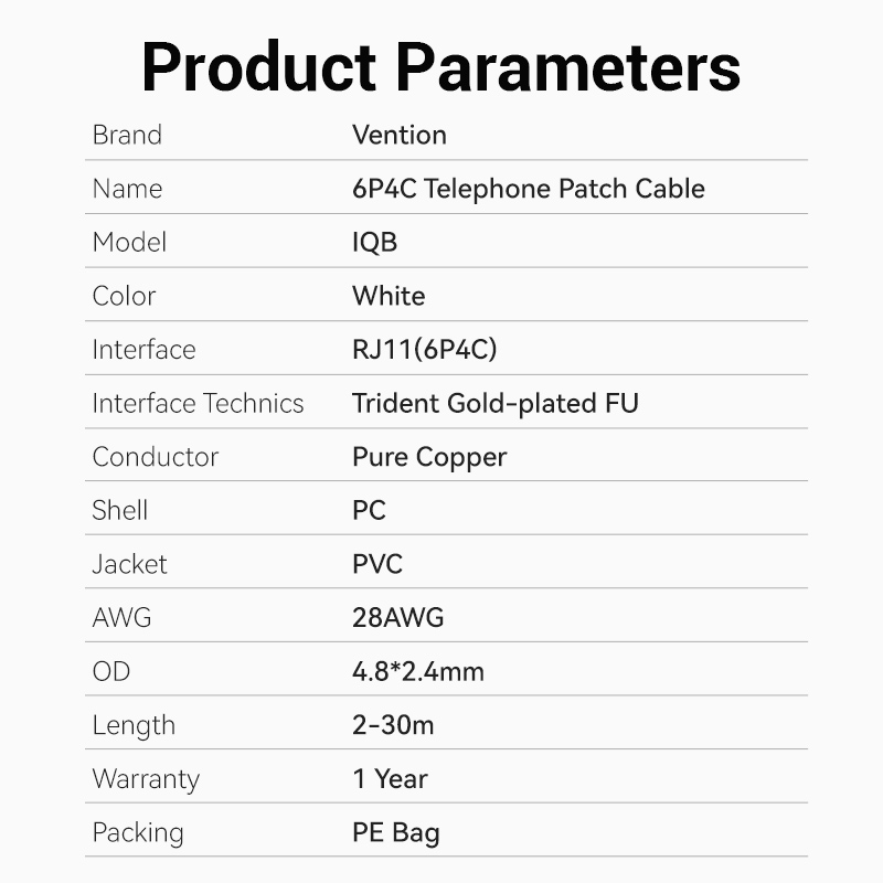 Технические характеристики VENTION RJ11 (6P4C) - 2м. Белый IQBWH