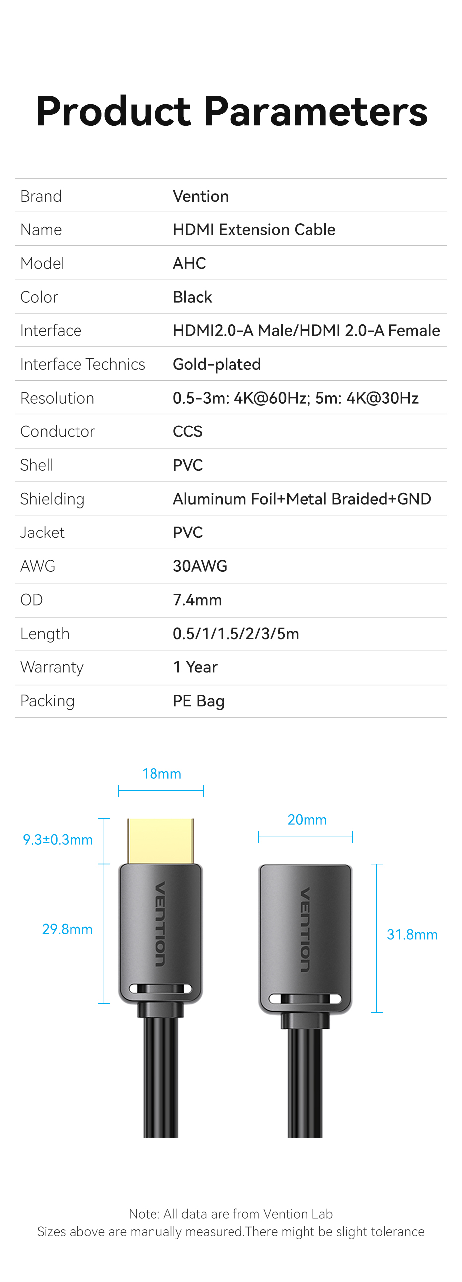 Кабель-удлинитель VENTION HDMI High speed v2.0 with Ethernet 19F/19M - 1м AHCBF