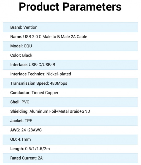 Вопросы и ответы о кабеле VENTION USB 2.0 Type C M/BM - 2 м. CQUBH